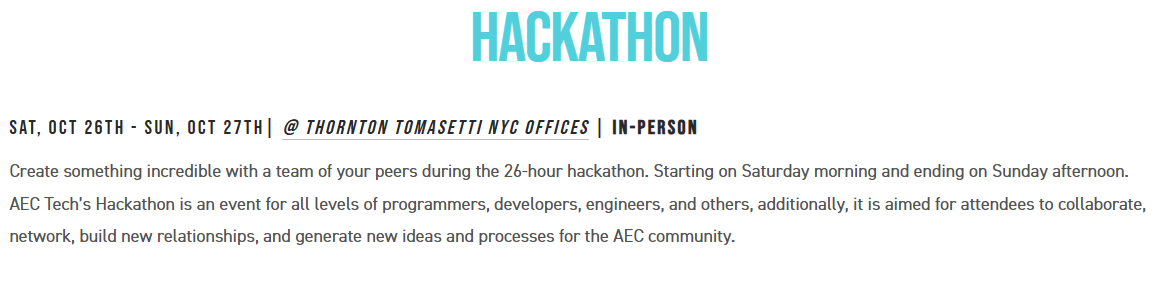 The week long event is composed of both virtual and in-person workshops, tech crawls and tours, a symposium, and ending on a 26 hour hackathon over the weekend. The event is designed to encourage knowledge exchange, showcase emerging tools and workflows, and foster collaboration among industry experts and technology enthusiasts. Each year’s symposium has a different theme that highlights current trends and challenges, offering both practical and theoretical insights on the evolving role of technology in AEC.